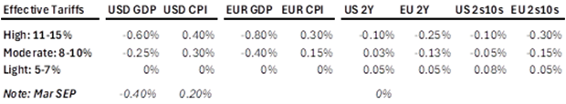 TARIFFS REMAIN A HIGHLY UNPREDICTABLE FACTOR for the global economy and there’s no edge in predicting outcomes. We have done some analysis on the high-level scenarios that might play out. The table below (h/t: Grant Wilder) highlights three scenarios (high, moderate, low) for effective tariff rates and their likely impact on growth and inflation. In the most negative scenario, we see a 0.6% hit to US GDP in 2025, whilst the inflationary impact could be as much as 0.4% on the CPI measure. Following President Trump’s announcement of 25% tariffs on foreign-made automobiles (starting 2 April), the inflation market reacted accordingly with 2y breakevens rallying ~10bps to reach a multi-year high of 3.28%…our inflation trader Durham Abric noted “75% of US vehicles are imported (5.5% CPI weight), implying 1% upside given a full pass through to CPI”, whilst appreciating that pass-through will be limited by demand destruction, margin compression and likely rotation into the used car market. This is simply a preview of what lies in wait for “liberation day”…though it’s important to note that Administration officials have signalled there will be specific details as part of the announcement with reciprocal tariffs likely to be imposed at the country level (as opposed to products) based on factors such as pre-existing tariffs, currency manipulation, VAT and non-tariff barriers…with an emphasis on ~15 countries considered to be the worst offenders (highest trade surplus’ against the US). In addition to the reciprocal tariffs, there are likely to be ones on individual sectors, potentially pharma and semiconductors. The chronology is likely to be…high level announcements on 2 April…then individual countries will have the chance to negotiate…a drawn-out process. This suggests to me a phased approach, likely to result in a material and extended impact on both spot inflation and inflation expectations. The implications for growth will depend partly on how financial conditions react to the announcement…on the one hand, the relative certainty compared to the back-and-forth of recent weeks could provide some respite for risk assets…on the other, the hit to consumers as the largest component of GDP may just be too much to ignore. For now, President Trump (like the Fed) will be buoyed by the hard data holding up – so don’t expect much let up in the tariff agenda.