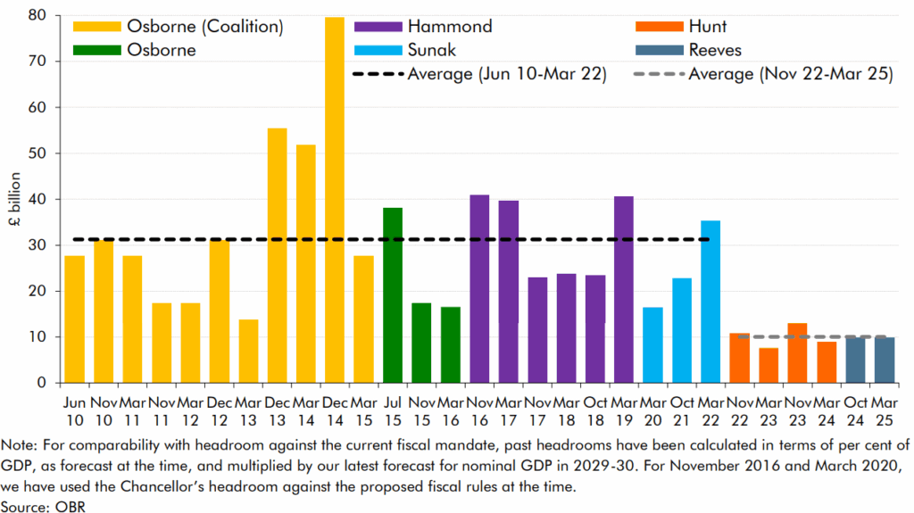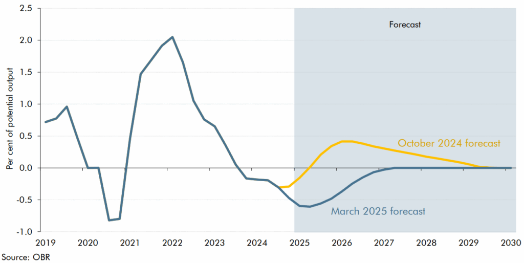 MEANWHILE IN BLIGHTY…the outlook continues to get even more challenging. UK Chancellor Reeves was forced into substantive adjustments in her Spring Budget due to her self-imposed “fiscal rules” (current spending must be balanced with tax receipts by 2029/30) revealing a £14bn plan to fix the public finances. The fiscal outlook has sharply deteriorated since the budget in October…with higher debt interest repayments and lower tax receipts contributing to a move from £9.9bn of “headroom” to a deficit of £4.1bn. Chancellor Reeves sought to restore the headroom with a number of measures including cuts to welfare benefits, broader reductions in spending, more emphasis on tax collection and boosts from other policies such as planning reforms. However, the independent Office for Budget Responsibility (OBR) poured cold water on the announcements suggesting there was only a “very small margin” of flexibility, which could easily be wiped out by an escalating trade war or similar factors. Indeed, the current headroom is amongst the lowest of any Chancellor since 2010 (see below). What’s striking is the OBR’s downward revision of 2025 GDP growth expectations from 2% in October to 1% now…owing to a mix of structural weakness in productivity and cyclical factors such as consumer confidence and higher rates…indeed the forecast path for the output gap was revised significantly with a trough of -0.5 in 2025 (chart below). By imposing such a stringent framework, Rachel Reeves has created a highly uncertain backdrop for the UK macroeconomy…with trade uncertainty and such limited fiscal space, the risk is one of constant speculation around imminent tax rises in coming months…and that’s with tax as a share of GDP already forecast to rise to 37.7%, a post-war high! Speaking to Ben Broadbent (former Deputy Governor of the BOE), a member of our Global Thought Leaders Program, he sees “risks to activity from fiscal policy are skewed to the downside, simply because the fiscal rules apply to the headline (and not the cyclically adjusted) deficit. So, if she’s constrained by those rules, and growth weakens for some other reason, depressing tax receipts relative to the OBR’s projections, fiscal policy has to be tightened.”. Whilst the market lacks confidence in growth and fiscal policy, Gilt yields in the 10y+ sector will struggle to come lower…and if indeed this all leads to a much weaker growth outcome, then the BOE will surely have to respond with an acceleration of cuts in the second half of this year (currently 50bps priced by Dec) . A further steepening of the 5s30s curve seems sensible.