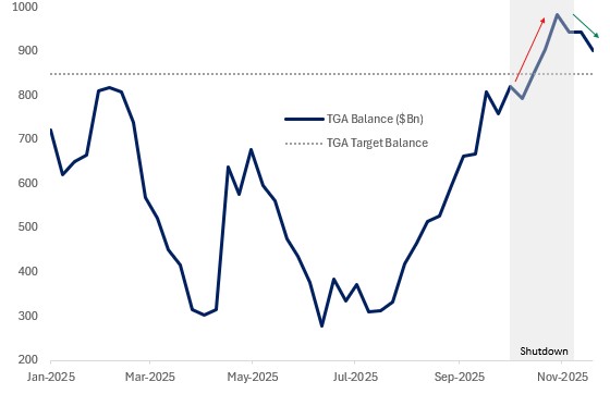ALL OF THIS IS UNSETTLING FOR RISK ASSETS…which have become accustomed to loose financial conditions buttressed by easy monetary and fiscal policy. FCI has been easing consistently since April – to the tune of 100bps – reaching multi-year lows last month. As I’ve suggested before, this was not a stable equilibrium and tightening was overdue – either from the rates channel or equities. Indeed, if we look at the long-term history of the Z-score of FCI (chart above), we see that at +/-2sd it tends to signal a turning point…and this is exactly what we’ve seen over recent weeks with a tightening of ~40bps in FCI, driven by a combination of the policy factor (rates) and risk assets (equities lower, credit wider). Another important factor in the sell-off is liquidity…which has been drained in recent weeks due to a confluence of factors that are yet to be fully resolved. The Treasury General Account (TGA) build from $300bn to ~$1tn in October definitionally depletes reserves…and the build was particularly rapid recently due to the shutdown…meaning that outflows – which create private sector reserves – were curtailed, whilst bills issuance – which drains private sector reserves – was high. The relationship between liquidity and risk assets is complex and certainly non-linear, but there was some hope that once the government shutdown ended and as the end of QT approached, liquidity would improve, and funding stress would relax. However, the TGA has started to decline but still sits at $900bn, some $50bn above its target level and bills issuance remains seasonally elevated until the end of November. If liquidity remains relatively scarce and we are yet to normalise to the “ample” threshold (hard to measure in real time) then this remains a constraint on risk sentiment and market-based liquidity proxies.