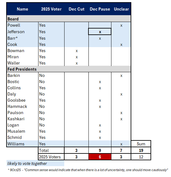 - Of the 12 voters: only 3 have stated they are likely to vote for a cut: Miran, Bowman, Waller