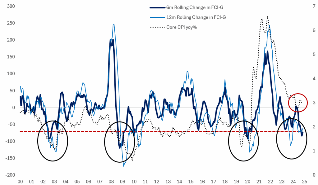 - The six-month easing in the Fed’s own measure of financial conditions is historically large — comparable to post-recession recovery periods, representing a tailwind equivalent to 50–75 bps of one-year forward annualized growth.