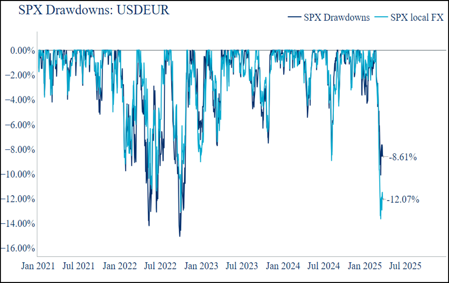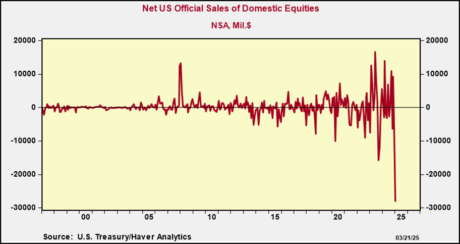 THE BIGGEST CONCERN FOR RISK MARKETS continues to be the uncertainty around tariffs. The expectation is that 2nd April will bring the announcement of a “reciprocal approach” framework under the guidance of US Trade Representative Jamieson Greer. Reports suggest he has brought discipline and rigour to the process and reinstated aspects that were missing from prior tariffs implemented on Canada-Mexico and China such as a formal process of receiving feedback from corporates. In addition, there are reports of a simplification of new tariff rates by sorting nations into a tiering system incorporating three levels, thereby avoiding some of the complexities…and Secretary Bessent noted that there was a focus on a “dirty 15” group of countries with the largest trade surpluses against the US. It seems to me that the Administration is trying to get more of a handle on the narrative and tighten up the process…time will tell if this will be enough to stall the slide in equities. As mentioned last week, the broader implications of a strategy to eliminate the US trade deficit will have profound implications for global asset prices in the medium term – something that markets have not fully appreciated. Following 2nd April, if the trade war escalates, it’s easy to see global investors drive the de-coupling of their historical overexposure to US assets, with a dramatic impact on both stock prices and bond yields. In the first instance, this would involve non-US investors fx-hedging their unhedged exposure to US assets. Traditionally, in a typical “risk-off” scenario USD strengthening provides a buffer against equity market drawdowns. However, what we’re now seeing is risk-off with a weaker USD, which amplifies losses (chart below; h/t Grant Wilder). Beyond this, investors will look to diversify their investments into non-US assets…we are already starting to see this with ETF flows into Europe, where equity valuations remain cheap on a relative basis to US, and with the boost from fiscal policy, the growth outlook has materially improved (as have the attractiveness of bund yields). Not quite the end of US exceptionalism…but watch this space.