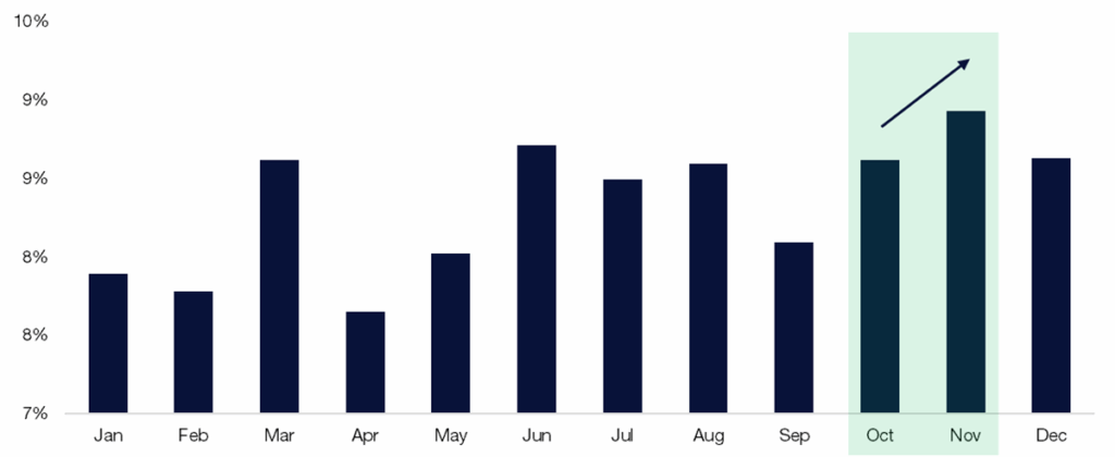 2. Citadel Securities’ Retail Equity client seasonal demand trends from the last 8 years: Sep weakest → Oct builds → Nov strongest