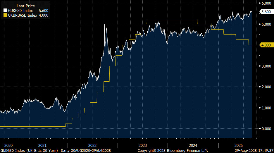 Source: Bloomberg, 29aug25UK 30y Gilts; UK Base Rate