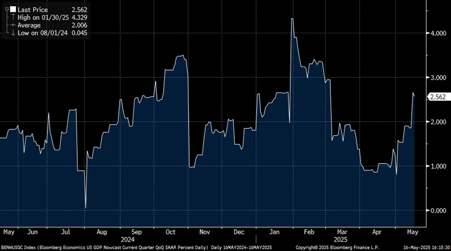 THE MARKET’S RE-RATING OF US ECONOMIC GROWTH IS NOW IN FULL SWING…buoyed by the US Administration’s dramatic U-turn on China tariffs on Monday. Following a sharp ratcheting after liberation day, there was an equally dramatic de-escalation this week with both sides agreeing to slash tariffs by 115% and a 90-day pause, suggesting further normalization to come. President Trump proclaimed a “total reset” in relations with China with a likely discussion with President Xi soon. Whilst there will inevitably be further headlines on this topic, in my mind this reflects a firm desire from POTUS to swiftly conclude the broader tariff agenda and focus on pro-growth policies…namely tax cuts and deregulation. Comments from Secretary Bessent, Director Hassett and the President himself all suggest that they want to move on from this saga…whilst we can expect some deals with the EU, Japan, and India, it seems likely that the Administration will unilaterally agree tariffs with the majority of trading partners. The market has realized this…first easing FCI through the rates risk-premium channel…then upgrading expectations of cyclical growth, led by performance in the equity market (SPX +20% from the lows). In simple terms, from mid-February financial conditions tightened, reaching their peak just after liberation day, signalling a stagflationary shock – a big hit to growth, likely leading to recession…and an inflationary spike driven by tariffs. This was a big headwind for business investment and consumption, and more broadly for investors in US assets…the beginnings of an unwind of “US exceptionalism”. Following acute pressure from both bond and stock markets, President Trump’s reversal has now caused a sharp easing of financial conditions, turning those same headwinds into tailwinds. As Q2 takes shape, the backdrop for US economic growth has become very bullish.