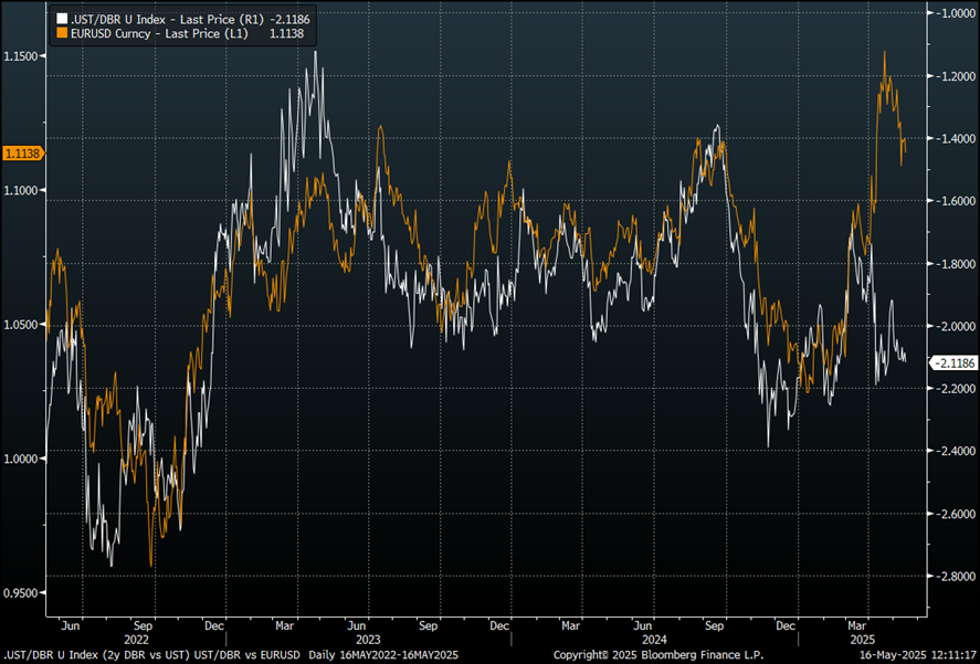 THE FED REMAINS OUT OF PLAY. An environment of moderate tariffs is problematic for anyone expecting rate cuts. With current proposed levels, after consumption shifts, the effective tariff rate for the US economy is 16.4% according to the Yale Budget Lab (though I would say there is downside risks to this number, given the direction of travel). This has a Real GDP impact of -0.65% on Q4-Q4…not enough to warrant a recession, given the starting point. At the same time, Durham Abric, our inflation expert, estimates Core PCE at 3.35% YoY under these circumstances. That is not an environment in which the Fed is cutting rates…and I do not see them cutting at all in 2025. I mentioned last week that the US front-end was pricing too much in the way of cuts and this has continued to correct, moving from 100bps of cuts priced on 30 April to ~55bps now. Given this represents a probability-weighted distribution of outcomes, it no longer looks out-of-whack, though I would expect it to trend towards zero gradually over time. Where valuations do look out of lockstep are in USD fx…whilst the market was focused on the unwind of “US exceptionalism” theme, it made sense that the currency took the brunt of the hit…both from hedging of fx exposure and the sale of US assets. With the 180 degrees change in the narrative…and equities and rates responding accordingly…the desire for global investors to own US assets on an unhedged basis should revert closer to where it was…and the fx market should move back to trading rate differentials. On that basis, EURUSD looks around ~8% overvalued (chart below).