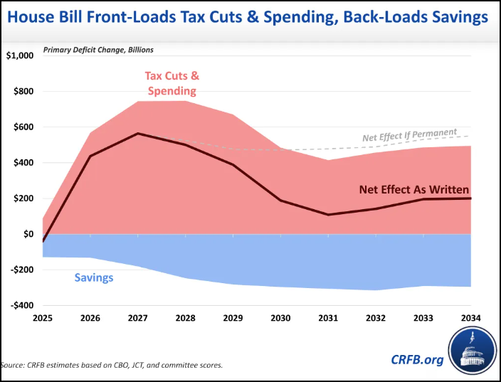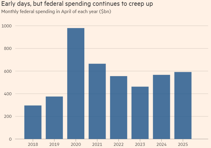 WHAT’S THE BULLISH CASE? Let’s start with fiscal. As budget negotiations continue to evolve, it’s becoming clear that the House bill would add $3.3tn to the debt (including interest) or $5.2tn if temporary provisions are made permanent, according to the Committee for a Responsible Federal Budget (CFRB). This is partly because new borrowing is front-loaded, whilst offsets are back-loaded…essentially leading to massively increased deficits in the next few years. CFRB estimate a $600bn boost to the deficit for FY27 with ~$770bn of new borrowing and ~180bn of cost reductions. This is a full 1.8% of GDP and represents a one-third increase in total projected deficits to $2.3tn and a doubling of the primary deficit. As the chart below shows, the bulk of tax cuts and spending happens in the 2026-29 window, whilst savings don’t kick-in until the second half of the 10yr budget window. Make no mistake. This is clearly by design and represents a substantial fiscal impulse and boost to growth (and inflation). Meanwhile, the much-anticipated savings from DOGE – once mooted to be as much as $2tn – are rapidly paling into insignificance. Their website claims $170bn in savings, but an FT investigation suggests only a fraction of that can be verified. At the same time, federal spending continues to rise with total outlays of $592bn in April, up both in MoM and YoY terms.