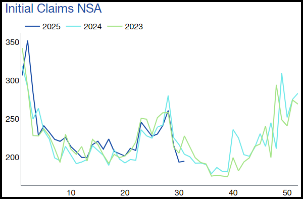 In my mind, what’s more important is the forward trajectory of the labour market in the context of the broader economic landscape…on that front, when looking at the Dallas Fed Weekly Economic Index, which is based on high-frequency economic data, we can observe the impact of President Trump’s April tariff measures creating a softening from May to mid-June…but since then, we have seen a clear uptick (chart below). Naturally, jobs data will operate with some lag, but this suggests we could see a swing upwards in NFP in the coming months. True labour market weakness – of the recessionary kind – only happens when you have an acceleration of layoffs…and we are just not seeing that.