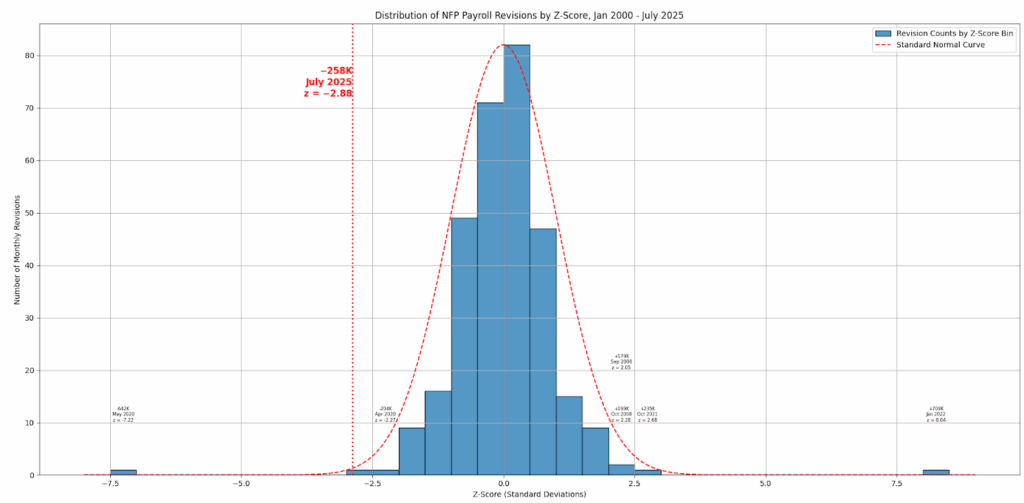 WEAKNESS IN THE US LABOUR MARKET IS MORE PRONOUNCED…with the recent Payrolls report bringing down the 3m Avg. for NFP to 35k. Although revisions of this magnitude could signal a recession, it’s important to consider the broader backdrop before reaching that conclusion. As mentioned in this note before, following President Trump’s tighter immigration controls, the breakeven level for NFP is ~75k now, and whilst the all-important u/e rate did rise to 4.2479% (the highest since Oct 2021), it remains broadly within the 4.0-4.2% rounded range of the last 15 months…so weakening, but not recessionary…especially when compared to historical levels. Similarly, Average Hourly Earnings (AHE) have been stable…and Initial Jobless Claims 4wk Avg. is ~220k, still far from concerning levels (350k+) and exhibiting some of the seasonality we have all become accustomed to (chart below). However, private sector job creation has undoubtedly weakened in recent months. So, what to make of the substantial 258k cumulative downward revision in NFP? Front-end rates were quick to extrapolate the weakness and price in greater recession risk, reflecting the approx. 3-std deviation move below the mean of historical revisions. An interesting paper by Peter Earle of the AIER, highlights that NFP revisions are not normally distributed. Instead, monthly revisions have very high kurtosis (21.56) reflecting a distribution that is prone to producing outliers: “High kurtosis is a signature of a “fat-tailed” distribution: one where extreme values occur more frequently than a normal model would predict.” Past revisions reflect this behaviour, with even 7-std deviations from the mean. In other words, when looking at these revisions, it’s important to remember that the heavy-tail nature of BLS payroll data means it produces unusually large outliers more frequently than a normal distribution would predict – so whilst the -258k revision was certainly large, it wasn’t necessarily a game changer and policymakers should be wary of putting too much weight on this one number alone. That said, revisions of these magnitude are often clustered around turning points/shocks. The natural question then, is whether these recent revisions signal a turning point…we can’t rule it out…but I would argue that the April tariff announcements would qualify as a revision inducing event. To further quote from the article: “many of the most extreme revisions cluster around periods of major economic stress or transition, such as the 2008–2009 financial crisis and the COVID-19 pandemic, when labor market conditions shifted rapidly and initial estimates were based on incomplete or outdated assumptions”. Of course, these extreme turning points (GFC, COVID) were not reversed one month later as April’s tariff shock was…the rapidity of the decline in uncertainty following the tariff pause and subsequent market recovery should limit the extent to which we extrapolate past experience into this specific set of revisions.
