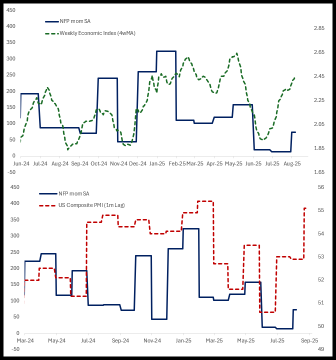 Non-Farm Payrolls with Dallas Fed Weekly Economic Index & Composite PMI