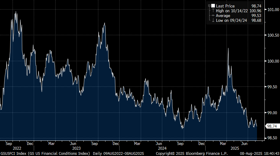 WHAT ABOUT THE BROADER BACKDROP? Q2 earnings season has been strong with 82% of S&P 500 companies beating EPS estimates and once complete, earnings growth is likely to be ~10% YoY, marking the third consecutive quarter of double-digit earnings growth. Whilst expectations were on the low side due to tariff concerns, this reflects a resiliency in corporate America which we’ve seen time and again. Tech hyperscalers have re-committed to their AI capex spend, taking the total to an estimated $360bn in 2025, a 60% YoY increase – this will continue to be a strong tailwind for the forward growth outlook. Consumption should hold up well with the boost in asset prices (both stocks and housing) and income proxies are running at 5.2% (AHE x total jobs x hours worked)…a healthy figure that should support personal earnings growth and ensure there is no persistent weakness in real household consumption. Financial conditions (FCI) are the loosest they’ve been in 3 years (chart below), suggesting a very supportive environment too…the rolling change in FCI should contribute +0.5% to GDP growth in 2026, should this continue. And President Trump’s recently approved fiscal package should add +0.9% to growth next year…especially important for individuals when considering the provisions regarding tips and state and local income tax (SALT) deductions. If we assume trend growth for the economy is around 2%, but is somewhat lower under reduced immigration, call it 1.5%…the above factors could still easily bring 2026 growth towards the 3% figure. And that’s before we consider what happens with tariff revenue…almost $30bn was raised last month, a 242% YoY increase. Secretary Bessent estimates a total of $300bn for 2025, which does not sound unreasonable…the question is what does President Trump do with this money…pay down the national debt? I doubt it. My bet would be he does another round of fiscal easing by distributing “tariff dividends” as a direct transfer to citizens, likely just ahead of next year’s mid-term elections. For all these reasons, I struggle to construct a bearish argument for US growth, even though the current spot outlook might be slightly weaker than originally expected. And remember, for markets, the FORWARD OUTLOOK is the only one that matters.