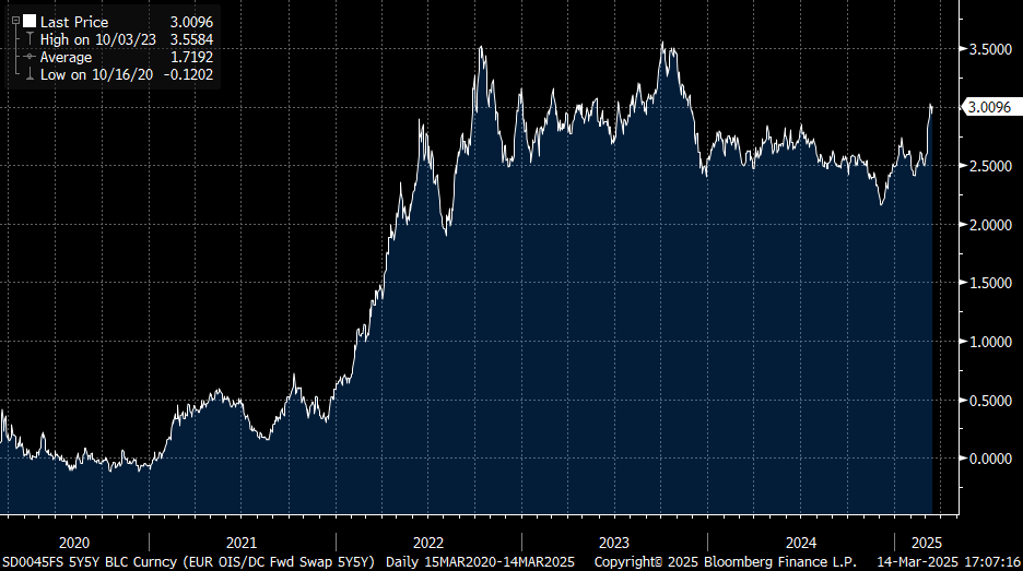 IN EUROPE…the good news continued with an agreement for a large fiscal package in Germany. Chancellor Merz has agreed a loosening of the country’s “debt brake” for defence spending with discussions of spending now exceeding 3% of GDP. In addition, there will be a 500bn infrastructure fund, with 20% earmarked for green transition in a comprise with the Greens…and individual states can now issue debt up to 0.35% of GDP. The package will go to a vote in the Bundestag on 18th March and then The Bundserat on 21st March but is expected to pass with no further hurdles. As mentioned last week, this is a very material boost to the EU economy…and with further measures to come from other EU countries, it creates a backdrop of growth momentum in the region. This is already starting to be reflected in the outperformance of European stocks (Estoxx +10% YTD), EURUSD (+5% YTD) and the sell-off in 10y bund yields (+50bps YTD). As this theme continues to proliferate, I would expect more of this price action with global investors increasing their allocations to European assets. I doubt the ECB will be cutting rates much beyond once more…so if you embed more term premium into the yield curve and inflation persisting above 2%…with greater issuance in the future, it’s reasonable to see EUR 5y5y yields 50bps higher from here over the medium term.
