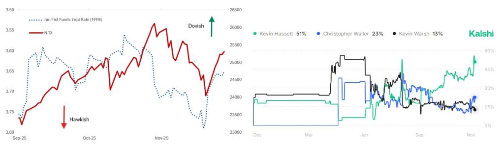 THIS WEEK’S (HOLIDAY-SHORTENED) PRICE ACTION WAS A REMINDER OF THE IMPORTANCE OF MONETARY POLICY IN DETERMINING SHORT-TERM GYRATIONS IN ASSET PRICES. Markets have become accustomed to supportive policy – both monetary and fiscal – with deviations from this norm being greeted with a nervy response…the ~8% drop in NDX from the all-time highs was predicated on (what seemed like) a hawkish pivot from Fed Chair Powell at last month’s FOMC presser, introducing uncertainty into the outcome of December’s meeting. Alas, NY Fed President John Williams’ dovish speech on 21st November has moved the probability of a rate cut back to 85% and stock markets have rallied almost all the way back. Beyond the moral hazard this engenders, it emphasizes the significance of the next pick for Chairman of the Federal Reserve. Reports suggest NEC Director Kevin Hassett has emerged as the leading candidate with Kalshi odds rising to 51% on the news, well above the nearest competitor (Waller, 23%). His front-runner status is attributed to both loyalty to President Trump and his broader reputation as a proponent of loose monetary policy. Markets currently expect the next Fed Chair to deliver more in terms of rate cuts beyond the remainder of Powell’s term with any incremental hawkishness from the current FOMC causing a re-distribution of cut premium into the next Chair’s term. Terminal rates at 3% are priced for a relatively dovish outcome already…in the context of a strong forward growth and inflation outlook in 2026. The market seems broadly comfortable with the idea of a dovish Fed chair – the dollar has stabilized; the yield curve is rangebound; 30y UST yields are anchored well below 5%; 10y breakevens are at the lower end of their range (2.25%). This makes sense…there is a credible argument for cutting rates at this juncture, which centres on the fact that there are real concerns about the health of the US labour market. Of course, one can argue the merits of further rate cuts – as well as the relative risks between the employment and inflation sides of the mandate – but the discussion is credibly grounded. In other words, the current context means that the immediate prescription is the same, regardless of the lean or credibility of the next Fed Chair. However, should the macro data start skewing towards a reflationary environment in which it’s clear that rate cuts are not warranted, then my sense is the market will start to focus on the risks associated with a loss of central bank credibility, namely a de-anchoring of inflation expectations leading to higher long end rates and a weaker currency. On paper, the combination of a dovish Fed chair and a reflationary macro outlook would still be a bullish environment for equities…but the reason why central bank credibility is so crucial is that history tells us that when credibility is lost, an over-correction is required to bring inflation back to target, likely forcing a much more severe recession than would otherwise transpire. A central bank with strong credibility (which the Fed no doubt has) needs only to administer marginal adjustments to generate its desired outcomes. This is not the case when that credibility is lost – larger moves are required to re-assert authority. Equity markets may struggle to price that initially, but a loss of central bank credibility is ultimately negative for stocks in the long term…so something which investors should be cognizant of as we approach the end of Chair Powell’s term. Whoever is the next Fed Chair must retain the institution’s inflation-fighting credentials…otherwise the consequences for global markets and the population at large could be severe.