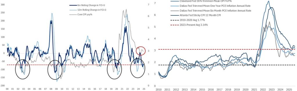 SO, WILL THE 2026 OUTLOOK PROVE A CHALLENGE TO THE DOVISH MONETARY POLICY NARRATIVE? I’ve been bullish on the forward growth outlook for some time, and it’s worth framing this in the context of financial conditions and the fiscal impulse. Smoothing through the average change over the last four quarters in FCI-G (the Fed’s measure of financial conditions) suggests FCI will add roughly 50-65bp to quarterly annualised growth next year…which comes alongside a fiscal impulse that implies an additional 50-100bp tailwind next year. Conservatively, this means ~100bps of stimulus relative to trend growth in 2026. Long-term estimates of US trend growth centre on 1.9-2.0%, but with a more restrictive immigration policy it’s reasonable to think this is around 1.75% for 2026…which would suggest real GDP growth next year in the region of 2.75% (a bottom-up economic forecast would add in various offsets from tariffs and uncertainty). A survey from the National Association for Business Economics of 42 professional forecasters suggests “the median outlook was for [US] growth of 2%, up from 1.8% in a prior October survey and in contrast to a growth rate of only 1.3% projected in June”. Consensus expectations of economic growth are clearly moving in the right direction, but I continue to think they’re behind the curve with respect to the improvement in the outlook since April’s tariff shock, especially given the performance of risk assets. The FOMC dot plot assumes 2.6% inflation (core and headline PCE) in 2026, which still implies a nominal GDP outlook of 5.35% (2.60%+2.75%). But…with stalled progress on underlying inflation which sits ~1% above the Fed’s target, and a 100bp positive output gap, I struggle to see a disinflationary impulse in the pipeline next year. If my outlook prevails, then we could see a world in which inflation simply stalls (or moves higher) and ends up around 3.0%. The consequence of this is 5.75% nominal GDP…exactly the kind of environment that would cause markets to test an overly-dovish Fed…an inability to price rate hikes (or indeed more rate cuts below 3%) in the face of higher growth and inflation would likely see the market find an alternative equilibrium in financial conditions – namely some combination of higher 10y yields and lower equities – to offset the inappropriate monetary policy stance. It’s difficult to weigh how much FCI tightening would be required should the market decide that Fed policy had become non-credible and the specific sequencing in stock / bond correlations. Indeed, it’s very possible that the initial move in risk assets would be positive as markets perceive pro-cyclical easing as good for forward earnings prospects…but that would simply mean that rates ultimately need to sell off more to offset this. Of course, any rapid move higher in bond yields would quickly become a headwind to stocks as 10y UST yields approach 4.5-5%. Furthermore, equity markets would need to account for the fatter left-hand tail of a more sizeable future policy tightening being required to get inflation back under control, should inflation expectations become truly de-anchored. In sum, it’s not clear to me that financial conditions will continue to ease should my 2026 outlook become consensus, regardless of how much the next Fed chair tries to ease. Markets – as ever – can act as a powerful speed brake to poor policy decisions.