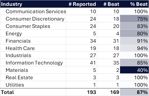 6. US corporate earnings expectations remain low. 169 of 193 companies (87%) who have reported beat earnings estimates. Confidence and clarity have become key themes of US corporate earnings thus far.