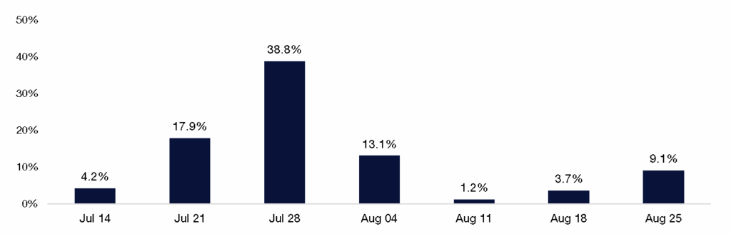 2. 88% of the S&P 500 market capitalization will have reported Q2 earnings by August 29th. 18% of the S&P 500 market cap reports earnings this week, led by the Communications sector. Alphabet (3.62% SPX weight) and Tesla (1.8% SPX weight) report quarterly earnings after market hours tonight. These are the first two companies of the “Magnificent 7” to report quarterly earnings. Nvidia is the last M7 to report earnings on August 27th.