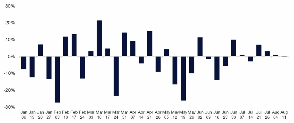Source: COT report, as compiled by Citadel Securities, as of September 2nd, 2025. Figures are for illustrative purposes only. Past performance figures do not guarantee future results.VIX August Monthly Performance