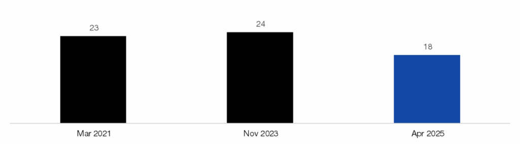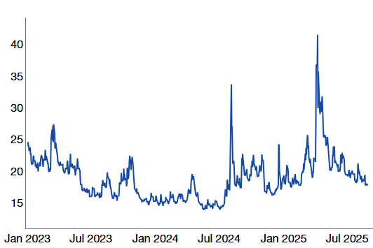 Source: AAII, as reported by Bloomberg and compiled by Citadel Securities, as of September 2nd, 2025. Figures are for illustrative purposes only. Past performance figures do not guarantee future results.17. CNN Fear & Greed Index: ~64 (75 = “extreme greed”), as of Sep 2, 2025