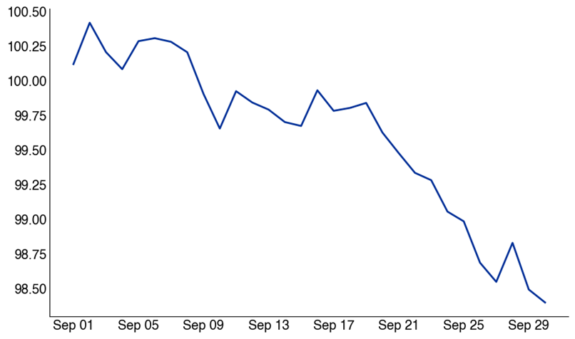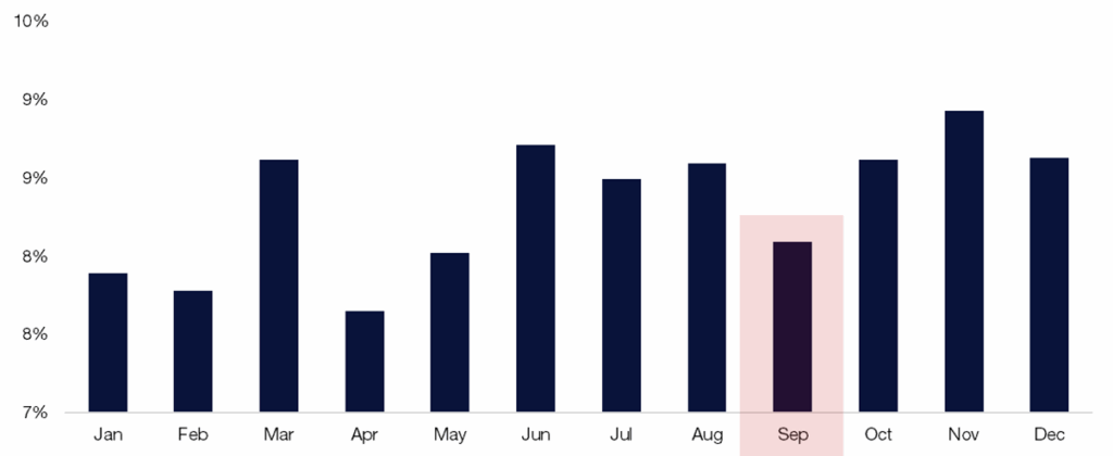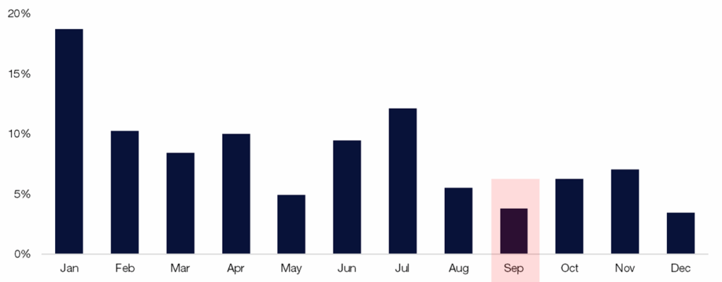Source: Bloomberg as compiled by Citadel Securities, as of September 2nd, 2025. Figures are for illustrative purposes only. Past performance figures do not guarantee future results.NDX September Monthly Performance