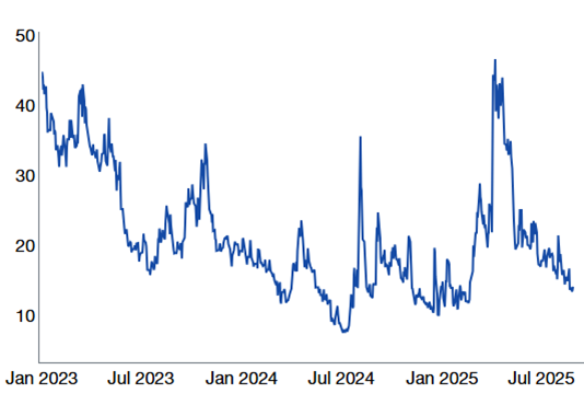 Source: Citadel Securities, as of September 2nd, 2025. Figures are for illustrative purposes only. Past performance figures do not guarantee future results.9. Volatility: Realized Collapsed; Implied Reset Lower
