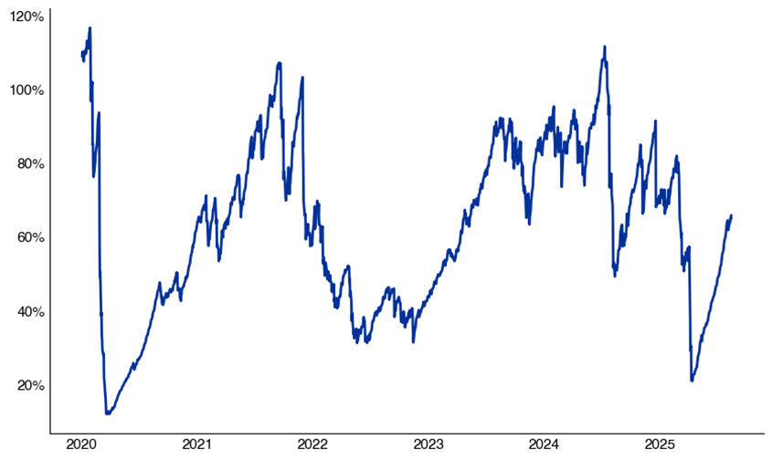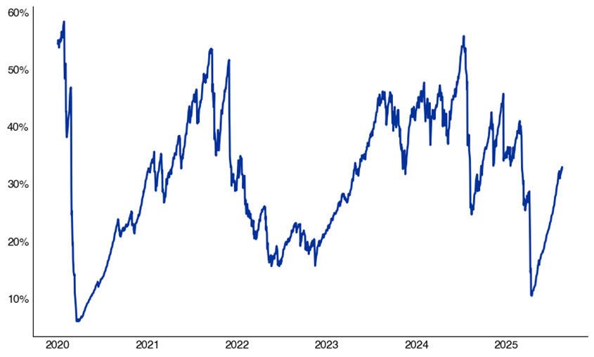 Source: COT report, as compiled by Citadel Securities, as of September 2nd, 2025. Figures are for illustrative purposes only. Past performance figures do not guarantee future results.CFTC NDX 100 Consolidated % Long