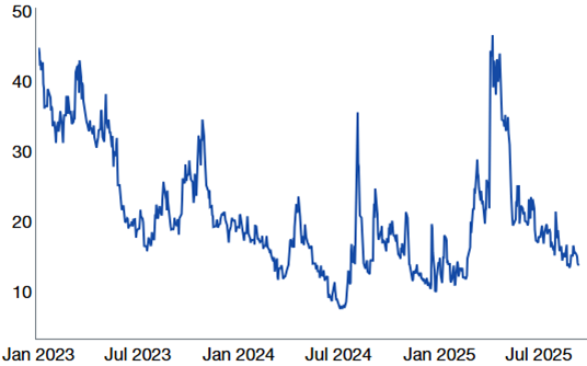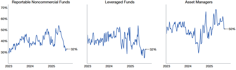 Source: Bloomberg as compiled by Citadel Securities, as of September 16th, 2025. Figures are for illustrative purposes only. Past performance figures do not guarantee future results15. Risk Parity strategies – driven by lower cross-asset volatility – now hold equity exposure near their 3-year average of 25% exposure.