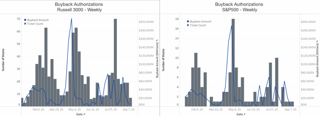 - EventVestor: U.S. authorizations have surpassed $1.2T (fastest pace on record) for Russell 3000; could reach $1.5T by year-end. Assuming a 90% execution rate → $1.35T actual executions (record). S&P 500 companies have seen $1T authorizations YTD.