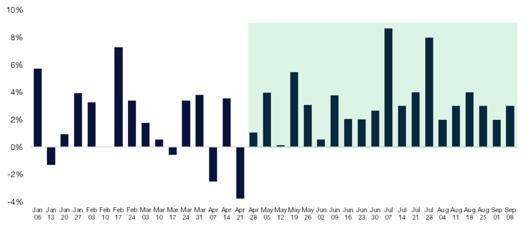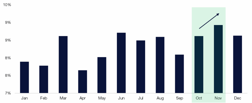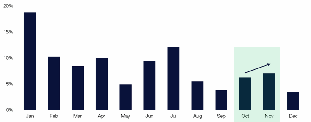 Seasonal trend: Sep weakest → Oct builds → Nov strongest