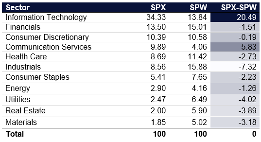 Tech weighting in SPX: 34.3% vs. 13.8% in SPW → +20.5% spread