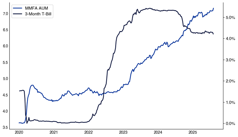 With ICI reporting money market AUM at $7.15T (up from $3.63T in early 2020), the key question becomes: what level of yields would prompt reallocation into risk assets if the Fed changes policy?