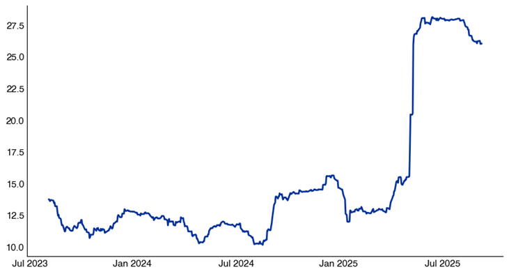 Source: Bloomberg as compiled by Citadel Securities, as of 8/12/25. Figures are for illustrative purposes only. Past performance figures do not guarantee future results.20. Risk Parity strategies – driven by cross-asset volatility – now hold equity exposure near their 3-year average of 25% exposure.