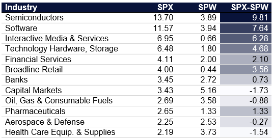 - Semiconductors: 13.7% (SPX) vs. 3.9% (SPW)