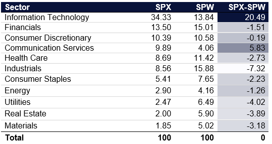 Tech weighting in SPX: 34.3% vs. 13.8% in SPW → +20.5% spread