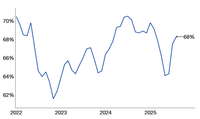 Source: AAII, as reported by Bloomberg and compiled by Citadel Securities, as of 8/19/25. Figures are for illustrative purposes only. Past performance figures do not guarantee future results.22. CNN Fear and Greed Sentiment Index rising, last 66 (75 = extreme greed)