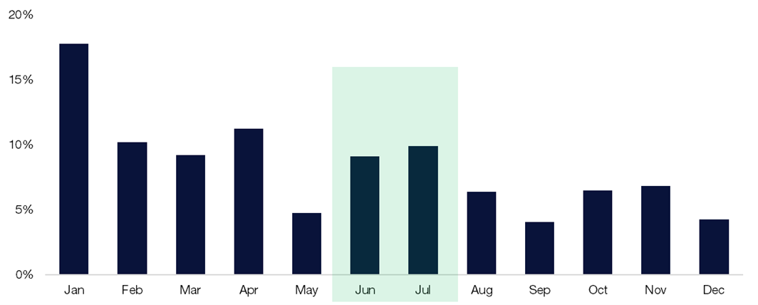 Source: Options Clearing Corporation, as reported by Bloomberg and compiled by Citadel Securities, as of 8/19/25. Figures are for illustrative purposes only. Past performance figures do not guarantee future results.III. Seasonality Watch: Q3 Asset Allocation Rebalancing