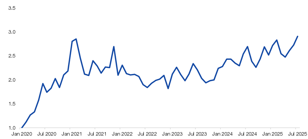 Source: Options Clearing Corporation, as reported by Bloomberg and compiled by Citadel Securities, as of 8/19/25. Figures are for illustrative purposes only. Past performance figures do not guarantee future results.US Equity Put Options, 3-month average, contracts in millions.