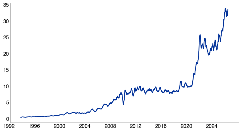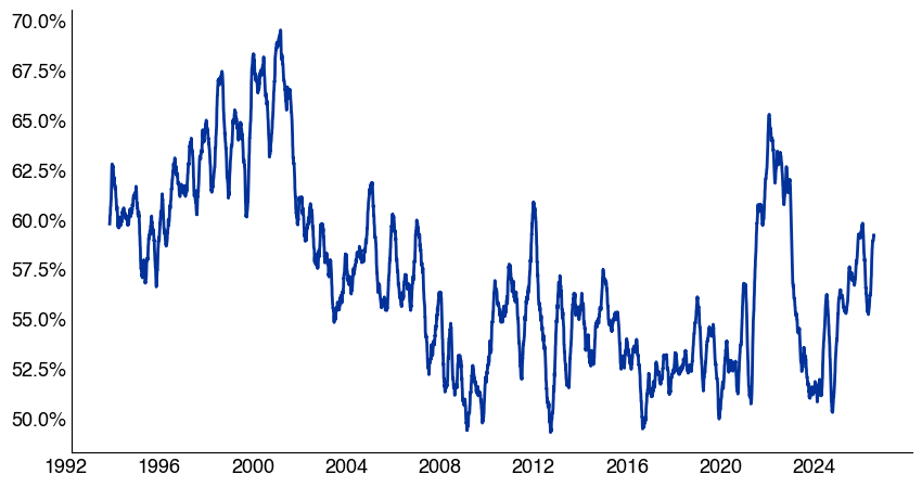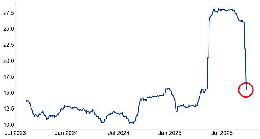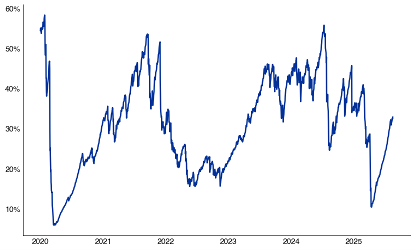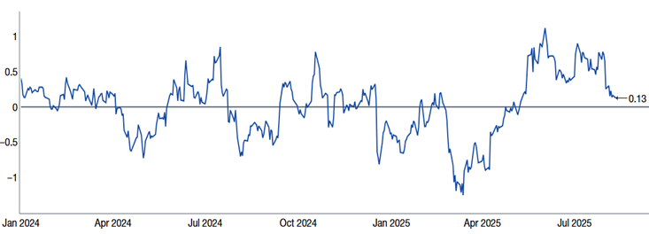 Source: Bloomberg as compiled by Citadel Securities, as of 8/19/25. Figures are for illustrative purposes only. Past performance figures do not guarantee future results.20. Risk Parity strategies – driven by lower cross-asset volatility – now hold equity exposure near their 3-year average of 25% exposure.
