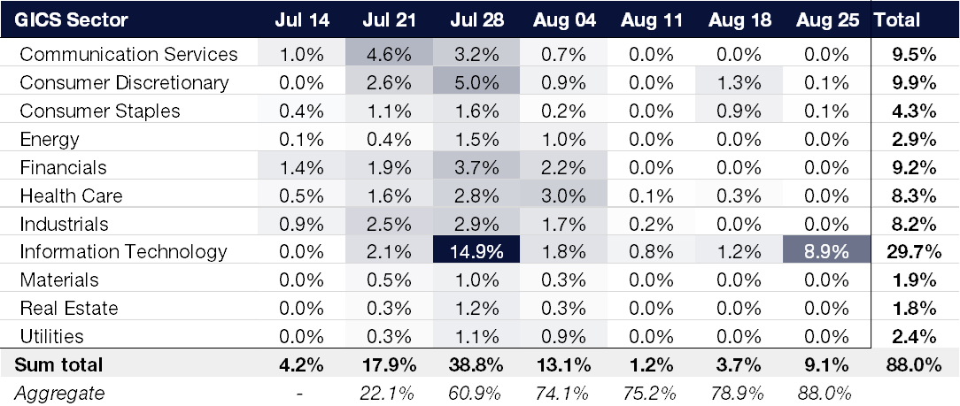 Source: Bloomberg as compiled by Citadel Securities, as of 8/19/25. Figures are for illustrative purposes only. Past performance figures do not guarantee future results.11. At the August peak buyback window, Tech remained the dominant source of corporate demand