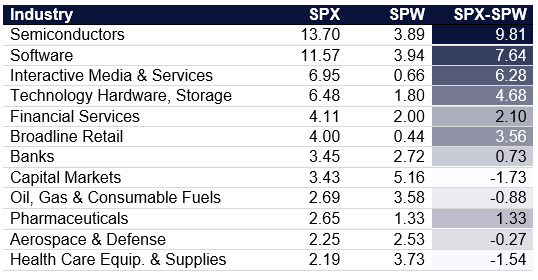 - Semiconductors: 13.7% (SPX) vs. 3.9% (SPW)