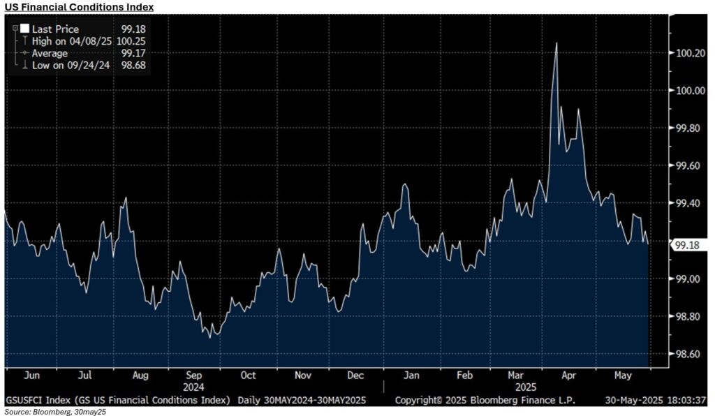 FISCAL IS THE DOMINANT POLICY LEVER FOR MARKETS…and this week’s developments continued to push on the theme of greater budget deficits. When President Trump’s bill passed through the House of Representatives, the assumption was that tariff revenues would offset some of the ~$3.8tn increase to the deficit over ten years. Estimates varied broadly, with anything from $200bn to $400bn a year being discussed. But now, if this number is substantially lower, then we should expect the deficit will expand further. Similarly, Elon Musk stepped down from his cost-cutting role at DOGE this week. Having originally planned to cut ~$2tn from the annual federal budget, thus far the department has claimed only $175bn in savings, much of it difficult to verify. Ultimately, this represents a missed opportunity…whilst some will have found his style objectionable, there’s no doubt that Musk highlighted egregious levels of waste within certain areas of government and shed light on vested interests entrenched within Washington. The fact that he was unable to make any headway tells you what a tall order it is to tackle public sector spending in the USA. All of this adds further pressure to budget deficits, which are now likely to hit ~7% of GDP…meaning that long-end bonds are unlikely to rally anytime soon. Whilst I was correct in my forecast last week that the bond market sell-off would stabilize into month-end (with re-balancing flows and heightened short positioning), it’s reasonable to expect over the medium-term that investors will continue to demand an elevated premium with the current backdrop. Foreign demand will not be helped by a provision (Section 899) in last week’s bill that allows the US to impose additional taxes on investors from countries that it deems to have punitive tax policies – something to watch, for sure, as this legislation continues its passage through Congress. As mentioned last week, however, my belief is that the US economy can handle higher yields, as evidenced by the robust growth picture over the last couple of years…so long as we don’t see a dramatic sell-off (the speed matters), I do not expect current yields to be a hinderance to economic growth or equity markets. Financial conditions remain relatively easy (chart below) with the weakness in the US dollar offsetting some of the impact of higher yields…indeed if the dollar continues to depreciate, then this becomes a meaningful forward tailwind for growth as it offsets the “typical” drag you’d expect from higher bond yields thereby increasing the fiscal multiplier compared to the past.