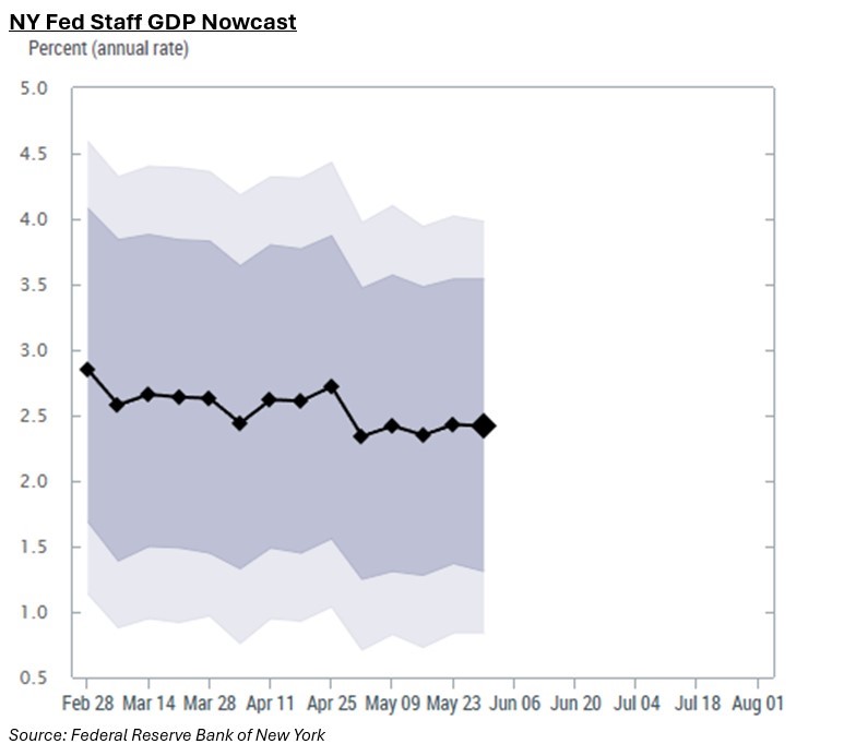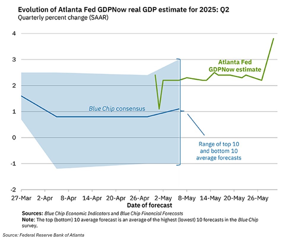 TREASURY SECRETARY BESSENT’S comments of the importance that “the economy grows faster than the debt” were important. This is the revealed preference of this Administration – the US must grow its way out of the debt. Accordingly, it’s very clear to me that there will be no course-correct on the fiscal trajectory from President Trump…the plan is to cut taxes, reduce regulation and lower energy prices to allow the US economy to do what it does best – innovate and expand. Part of the deregulatory agenda are two important proposals…first, changes to the supplementary leverage ratio (SLR) used to regulate banks, which should allow banks to hold more Treasuries by reducing capital requirements…and second, stablecoin legislation (part of the Genius Act) which encourages issuers in this space to hold T-bills. Both pieces of legislation should help support bond markets at a time of heightened issuance…however, the long-end will remain difficult as even these changes have a heavy emphasis on short-end duration. So, the playbook is clear…run the economy hot and grow your way out of debt troubles…whilst using parts of the regulatory toolkit to keep bond vigilantes in check. Well…as I’ve been arguing for many weeks, the growth picture is becoming clearer…both the top-down NY Fed GDP Nowcast and the bottom-up Atlanta Fed equivalent have US Real GDP tracking at 2.4% and 3.8% respectively (charts below)…not too shabby. This week’s Conference Board Consumer Confidence numbers showed a sharp reversal from the lows…as expected following the relief induced by President Trump’s reversal on tariffs. I would expect the hard data to follow this, but more importantly for market participants, the forward-looking outlook for risk assets will only continue to improve with incoming fiscal expansion and productivity gains unleashed from A.I. innovation in the coming 12-18mnths. In my mind, it’s very likely that trade policy will become a minor blot on the broader landscape of US growth dominance.
