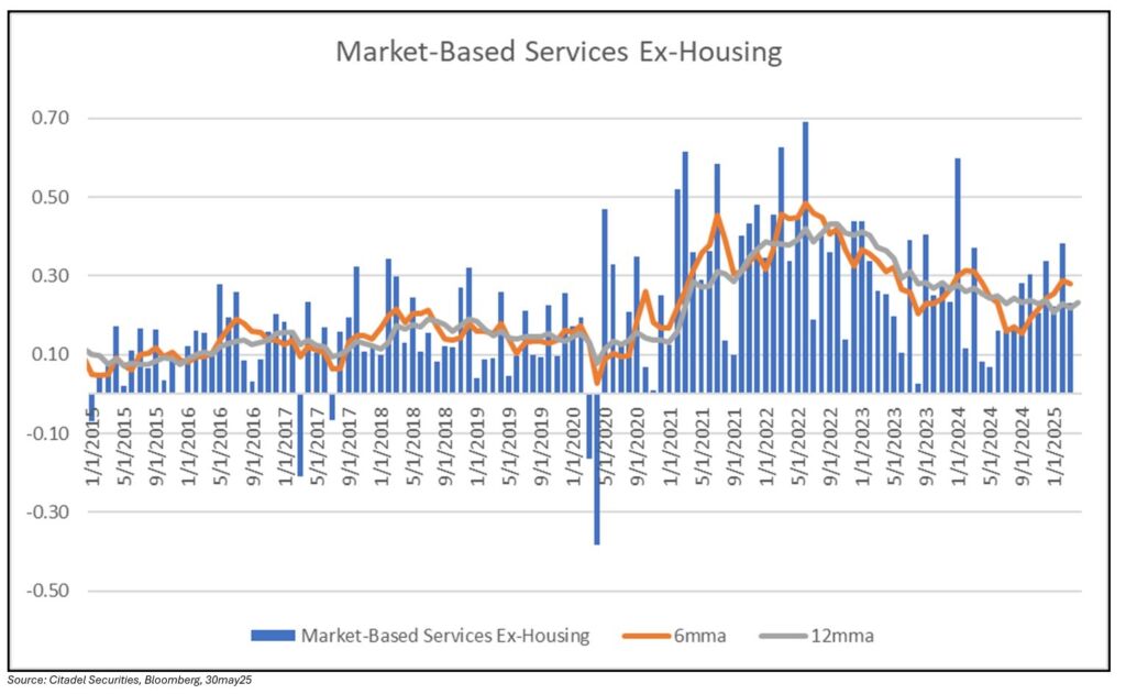 SO, WHAT’S THE CATCH? Inflation continues to remain elevated. Whilst at the top line Core PCE came in line with expectations (0.1% MoM, 2.5% YoY)…our inflation expert Durham Abric noted a drop in portfolio management fees was the driving force behind the moderation (which the Fed will care less about) and market-based core came in at 0.252% (3.07% annualised), which is not exactly cool. Moreover, Market-based Services Ex-Housing (Supercore), once the metric du jour, came in at 0.25% in April and maintains a 6mma of 0.27% (3.3% annualised) – that’s similar to levels we saw in April 2024 and higher than the average reading over the last two years – chart below. It’s hard to call that progress. If the economy is about to accelerate, these are not pleasing numbers for the FOMC. Chair Powell has rightly guided policy firmly to an on-hold stance…something which will not change anytime soon and I do not expect rate cuts in 2025. What’s more interesting perhaps, is what happens as he leaves the playing field…traditionally, the Chair sets the direction of travel and policy stance ahead of his departure – most transitions usually incorporate continuation of policy, at least for some months. If the bullish economic backdrop I’ve outlined materialises, then it would be natural for most central bankers to have a hawkish bias…which would stand in stark contrast to both President Trump’s preference…and likely the next Fed Chair. We shall find out what happens soon enough…whilst there’s no specific timeline, I wouldn’t be surprised to see a name soft proposed as early as late summer. Governor Kugler’s term ends on 31 Jan 2026…and her replacement will likely be the next Fed Chair. Another (unprecedented in 70 years) possibility is Powell remaining on the board, just not as Chairman…perhaps to monitor developments. Lots to play for. For asset prices, I remain of the view that equity markets should continue to perform well in this environment, buoyed by expansionary fiscal policy, steady interest rates, and deregulation…even more so as tail risks around policy-induced negative economic outcomes recede. In foreign currency terms, US equities are even more attractive given the circa 8% depreciation of DXY YTD. I would be a buyer.