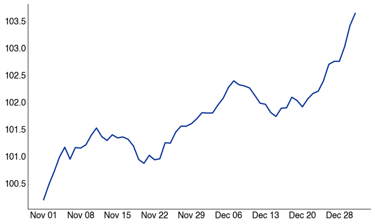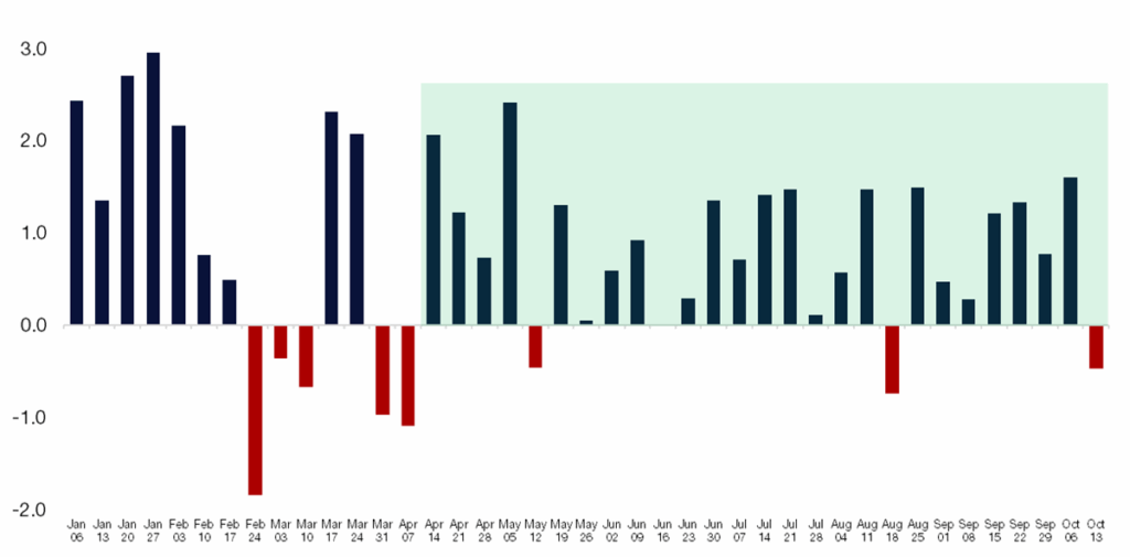 Source: Bloomberg as compiled by Citadel Securities, as of October 24th, 2025. Figures are for illustrative purposes only. Past performance figures do not guarantee future results.NDX Daily November Performance