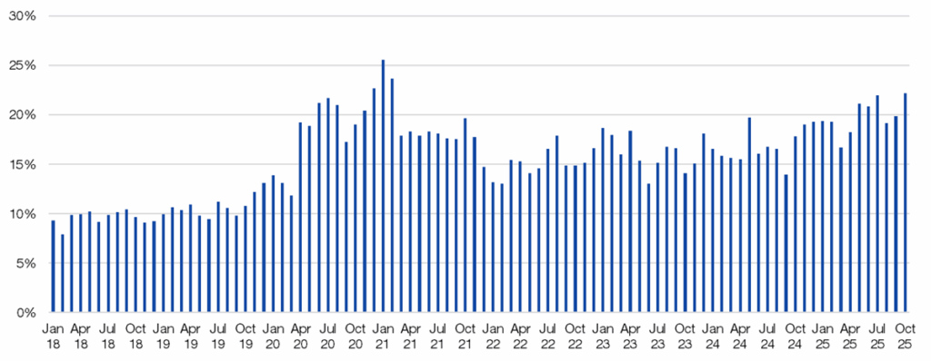 Source: Citadel Securities, as of October 24th, 2025. Figures are for illustrative purposes only. Past performance figures do not guarantee future results.Retail % of Total Cash Market (Shares)