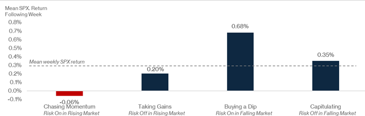 SPX weekly performance following retail risk behavior implied by Retail RORO and market state