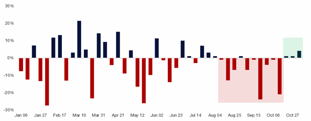 Source: Citadel Securities, as of November 10th, 2025. Figures are for illustrative purposes only. Past performance figures do not guarantee future results.Historical Retail RORO – 50 Most Liquid