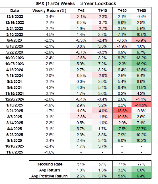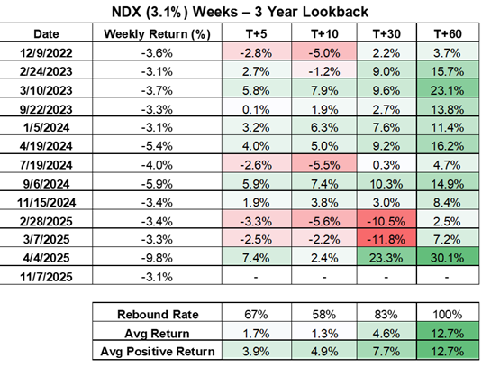 NDX posted its sharpest weekly drop since April 4, 2025 (“Liberation Day”), falling -3.1%. Over the past 3 years, there have been only 13 such weeks – and subsequent returns have historically been strong.