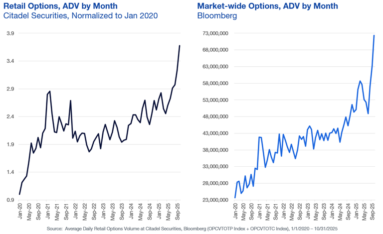 Source: Citadel Securities, Thomas Sozzi, as of November 10th, 2025. Figures are for illustrative purposes only. Past performance figures do not guarantee future results.Options Volume Hits New Highs