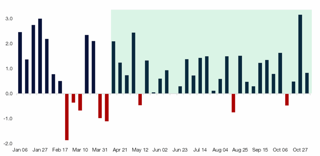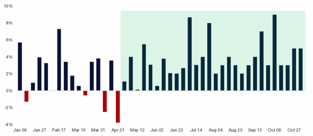 Source: Citadel Securities, as of November 7th, 2025. Figures are for illustrative purposes only. Past performance figures do not guarantee future results.2. Citadel Securities’ Retail Equity client seasonal demand trends from the last 8 years: Sep weakest → Oct builds → Nov strongest