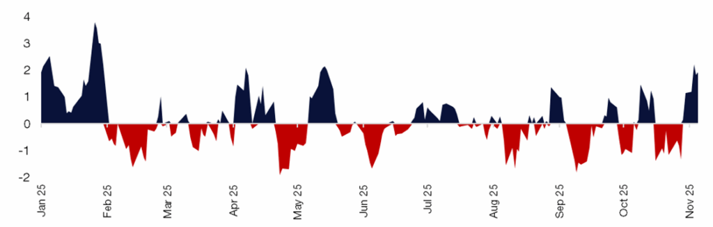 - Fed Still Leaning Hawkish: Fed Funds Futures imply a 66% probability of a 25bp cut at the December meeting. The key debate: how much further can rate-cut expectations decline before data justify a genuine policy pivot?